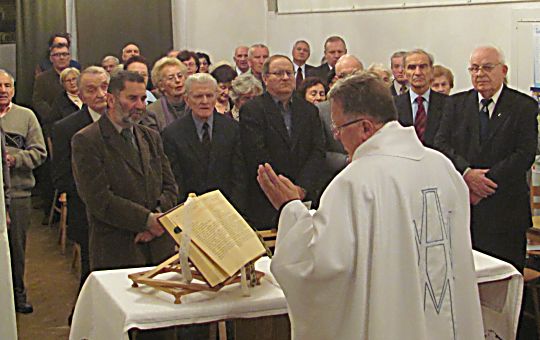 Na krótko – do 1 stycznia. W tym dniu, zwykle panująca na korytarzu cisza, zakłócona została narastającym gwarem coraz liczniej szych głosów i trzaskiem zamków otwieranych cel. Wreszcie i w naszej celi zazgrzytały rygle, drzwi otworzyły się nagle i klawisz krzyknął: – Wychodzić! Księża z Tarnowa przyjechali! Boże drogi! Wszyscy wybiegają na korytarz. Zostaję w otwartej już celi, bo ciężko chory Jurek W. potrzebuje akurat mojej pomocy. Słyszę znajomy głos dobiegający z korytarza: – Gdzie Krasnodębski? Gdzie Krasnodębski? Toż to przecież sam ksiądz biskup Jerzy Ablewicz! Wchodzi do celi. Ściskamy się. Pochyla się nad leżącym kolegą. Głos uwiązł w gardle. Tylko te niepokorne łzy na twarzy Jurka i mojej. Co za szczęście! Po chwili chaotycznej rozmowy wychodzimy na korytarz. Ksiądz Biskup wita się ze wszystkimi. Twarze rozpromienione, a oczy co chwilę trzeba wycierać. Rozmowy, rozmowy. Księża sprytnie utykają grypsy. Kraty na obu końcach korytarza zamknięte. Liczni strażnicy i zomowcy po drugiej stronie. My, w środku – zamknięci razem z Księdzem Biskupem i towarzyszącymi Mu księżmi. Wielu kolegów prosi o spowiedź. Zaczęła się Msza Święta… Nigdy już potem nie przeżywałem tak namacalnie Bożej Opatrzności, jak właśnie podczas tej pierwszej Mszy Świętej za kratami, a przecież miało ich być jeszcze tak wiele i nie tylko w Załężu… I pod koniec, tak prawdziwie wyrywające się z głębi skruszonego serca: „Panie, nie jestem godzien, abyś przyszedł do mnie…”. Ale przyszedł. Za sprawą naszych kochanych kapelanów i Biskupa. „Bogu niech będą dzięki”. Po skończonej Mszy Świętej otrzymaliśmy prezenty – paczki żywnościowe, różańce, medaliki, Pismo Święte. Krótkie pożegnanie, bo czas ucieka. Na następnych piętrach bloku więziennego czekają inni internowani. A my, uszczęśliwieni, wracamy do cel. Przenikliwy trzask zasuwanych rygli nie robi już na nas takiego wrażenia. Rozmowom radosnym nie ma końca. Nastrój wspaniały. „Siedzenie” niestraszne. Nawet śpiewać się chce.(…)