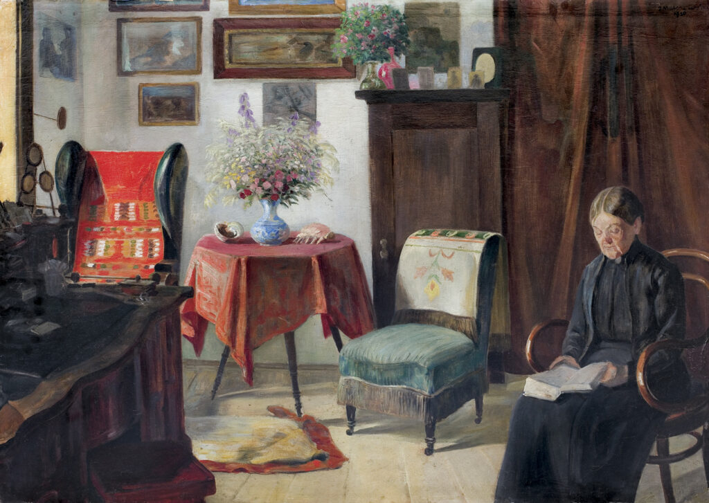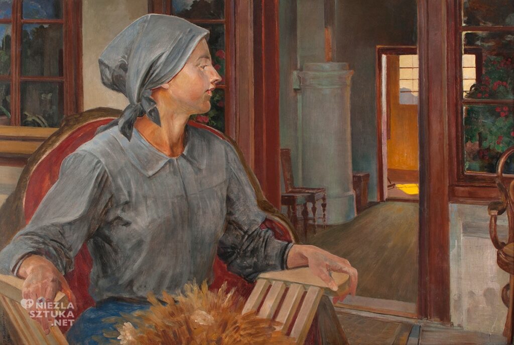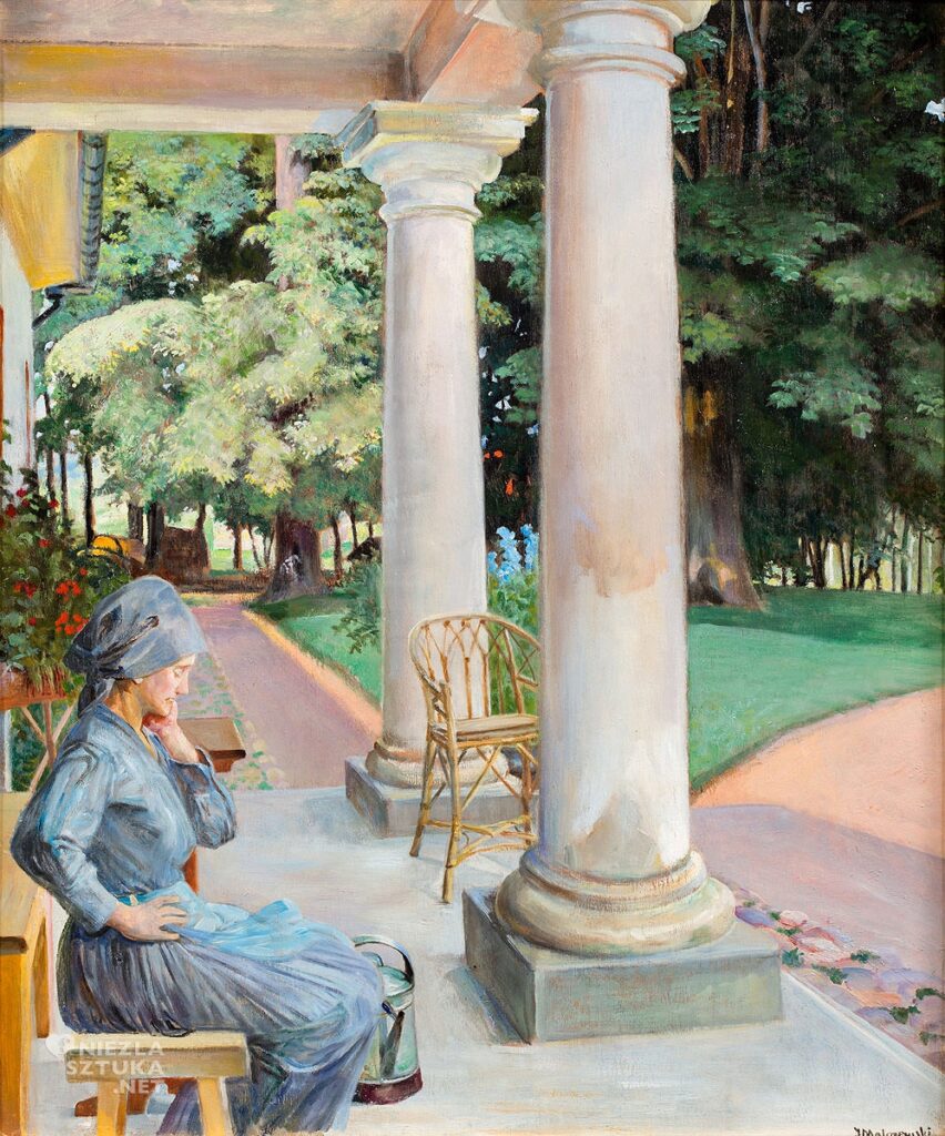 Inny obraz to „Ogrodniczka”, powstał również w 1922 r., w scenerii na którą składają się przepiękne, dorodne drzewa parkowe, fragment ganku z mocno zarysowanymi kolumnami podtrzymującymi zadaszenie i utrudzona kobieta, która siedzi na ganku w bezruchu z przymkniętymi oczyma regenerując siły, wyczerpane codziennym obowiązkiem pielęgnowania ogrodu. Obok kobiety stoi konewka z wodą, symbolem odrodzenia się i życia. Rozłożysty drzewostan parku „rzuca” obfity cień, chroniący siedzącą przed letnim upałem kobiet.