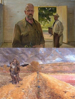 Dzieło „Przekazanie palety – Autoportret z Mieczysławem Gąseckim” powstało w 1922 r. Mieczysław Gąsecki był przyjacielem, pomocnikiem i malarzem Malczewskiego, przebywał razem z artystą w Lusławicach. We wnętrzu lusławickiej pracowni na pierwszym planie widnieje sylwetka artysty, a za nim stoi Pan Mieczysław, który trzyma w ręku paletę i pędzle symbolizujące przekazanie następnemu pokoleniu narzędzi pracy, które decydować będą o dalszym rozwoju sztuki. Gest ten sugeruje, iż wszystko się już dokonało w życiu artysty, a otwarte drzwi oznaczają czas opuszczenia już pracowni. Radosnym akcentem obrazu jest bijące światło upalnego letniego dnia, które zaprasza do wewnątrz, do ogrodu, zapewniając malarza o cieple i radości jakie przyniosą mu kolejne lata w jego życiu, chociaż nie będzie być może już tworzył.