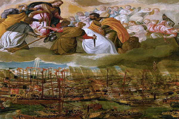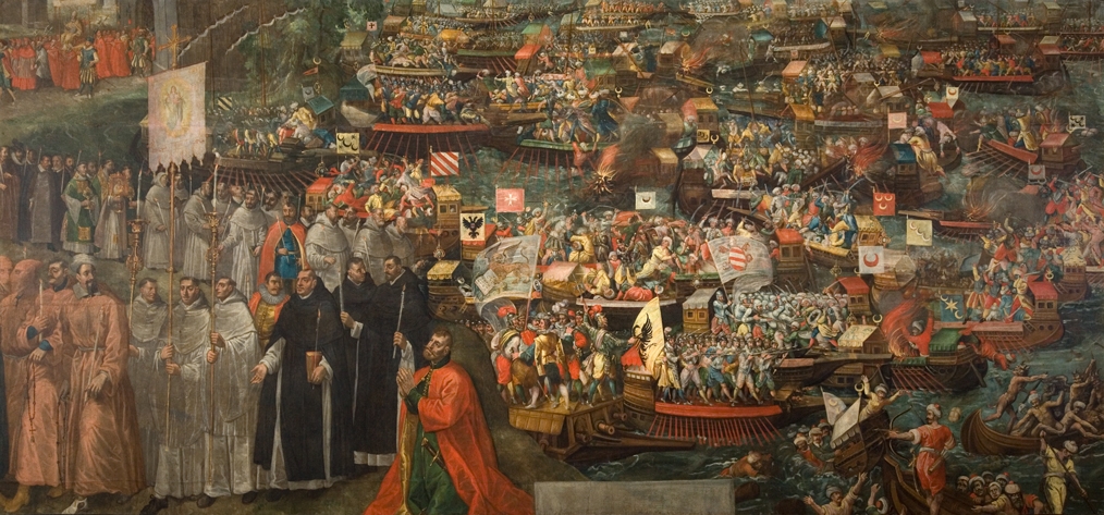 Okręty chrześcijan płynęły w formacji o kształcie krzyża, zmagając się z przeciwnym wiatrem (muzułmańskie w kształcie półksiężyca). Na maszcie galery flagowej Juana de Austria, Real di Spagna, powiewała wielka, błękitna chorągiew z Jezusem Ukrzyżowanym. Na pokładach okrętów panował nastrój religijnego uniesienia, choć wszyscy obecni mieli świadomość, iż wielu z nich nie dożyje zmroku. Żołnierzom i marynarzom rozdano medaliki i różańce. Kapelani spowiadali wojsko, błogosławiąc je na bój. Odmawiano modlitwę różańcową. Wielu żołnierzy utrzymywało potem, że widzieli Matkę Bożą błogosławiącą im z nieba.
