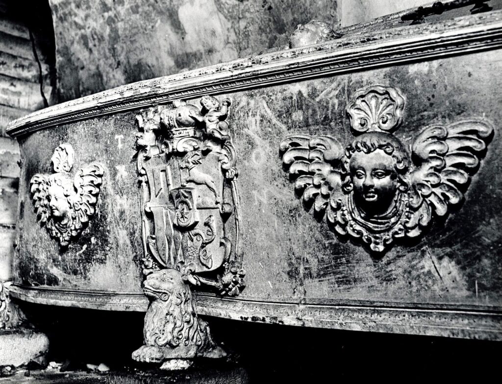 – Złocone inicjały T, T, X, O, H, N, K, K, które należy odczytać w następującym porządku: Teofila Tarłówna, Xiężna Ostrogska, Hrabina Niemiecka, Kasztelanowa Krakowska. Tarcza herbowa umieszczona na boku sarkofagu należy do rodu Teofilii Tarło i składa się z następujących herbów: własny Ostrogskich, Topór Tarłów,Brochwicz matki Barbary Sobkówny, własny babki ojczystej Urszuli Flitzinger (z hrabiów na Flitzing koło Fryzyngi w Bawarii), Trąby babki macierzystej Magdaleny Jordanówny. Ponadto sarkofag powstał po roku 1635, o czym świadczy dekoracja w postaci ornamentu małżowinowo-chrząstkowego, którego użycie przypada na ten właśnie okres. To są trzy dowody na to, że sarkofag jest własnością Teofilii Tarło.
