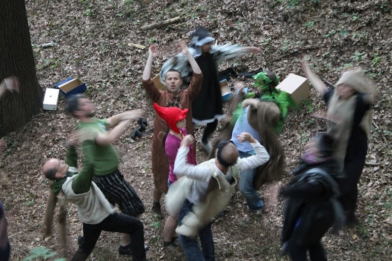 Ale Cezary Tomaszewski zaplanował po drodze kilka przystanków, na których zespół CC zaprezentował ironiczny dystans do tematu. Na pierwszym przystanku artyści rozbiegli się po dolince, przytulając się do drzew. Na drugim przystanku, w wąwozie, odbył się zbiorowy pogrzeb ulubionych zwierzątek – śpiewacy głośno płakali nad kartonowymi pudełkami, wygłaszając mowy pogrzebowe (np. Przepraszam, że cię wykastrowałem). Pogrzeb przeszedł płynnie w dość amatorską choreograficznie wersję ŚWIĘTA WIOSNY – ofiarą miał być tu Czerwony Kapturek, który jednak wyrwał się i umknął z krzykiem do lasu. Może chodziło o pokazanie, że dziś nie jesteśmy w stanie traktować poważnie związku człowieka z przyrodą, bo taki związek nie istnieje?Kilkadziesiąt metrów dalej nastąpiła scena finałowa, podczas której na trawniku wykonawcy najpierw rozkładali się z kocykami i radyjkami a potem, przy marszu weselnym Mendelssohna, rzucali się sobie w ramiona w rozmaitych konfiguracjach.