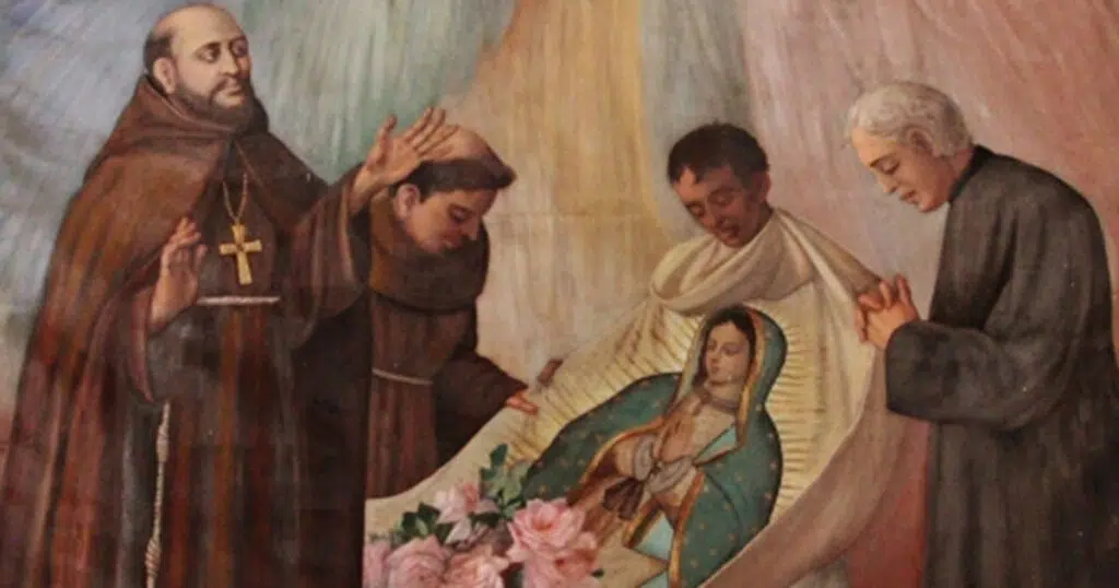 Opis objawienia z 1531 został zawarty w dziele Nican Mopohua autorstwa Antonio Valeriano. Tekst ten powstał w połowie XVI w. Według Nican Mopohua, biskup Juan de Zumárraga nie dowierzając relacjom Juana Diego o ukazaniu się mu Maryi na wzgórzu Cerro del Tepeyac oraz jej życzeniu, by na nim została zbudowana świątynia ku jej czci, domagał się przekonującego dowodu potwierdzającego prawdziwość jego relacji. Maryja przyjęła to wyzwanie i poleciła Diego przyjść następnego dnia, wspiąć się na wzgórze i zerwać kwitnące tam kwiaty. Kiedy ten to uczynił, Maryja sama ułożyła te kwiaty w wiązankę i ukrytą pod osłoną tilmy poleciła mu zanieść ją do biskupa. Kiedy Juan Diego zjawił się w rezydencji biskupa i odsłonił tilmę, kwiaty wypadły na podłogę, a na tilmie biskup ujrzał niezwykły obraz Maryi, przed którym upadł na kolana i ze łzami skruchy przepraszał Maryję za swe niedowierzanie.