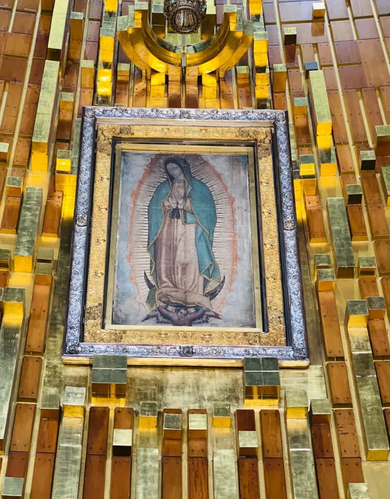 To właśnie w Nowej Bazylice, na centralnym pilastrze, znajduje się cudowny obraz Najświętszej Maryi Panny z Guadalupe. Dzięki okrągłemu kształtowi bazyliki, obraz Matki Bożej może być widziany z każdego punktu kościoła.