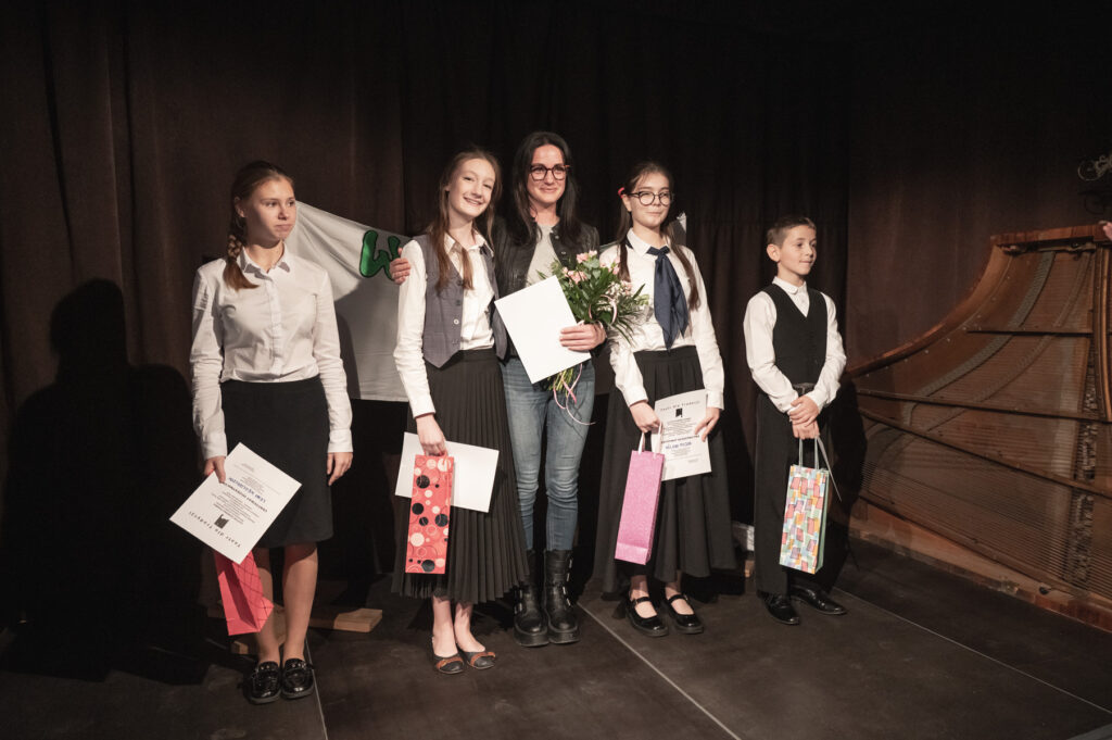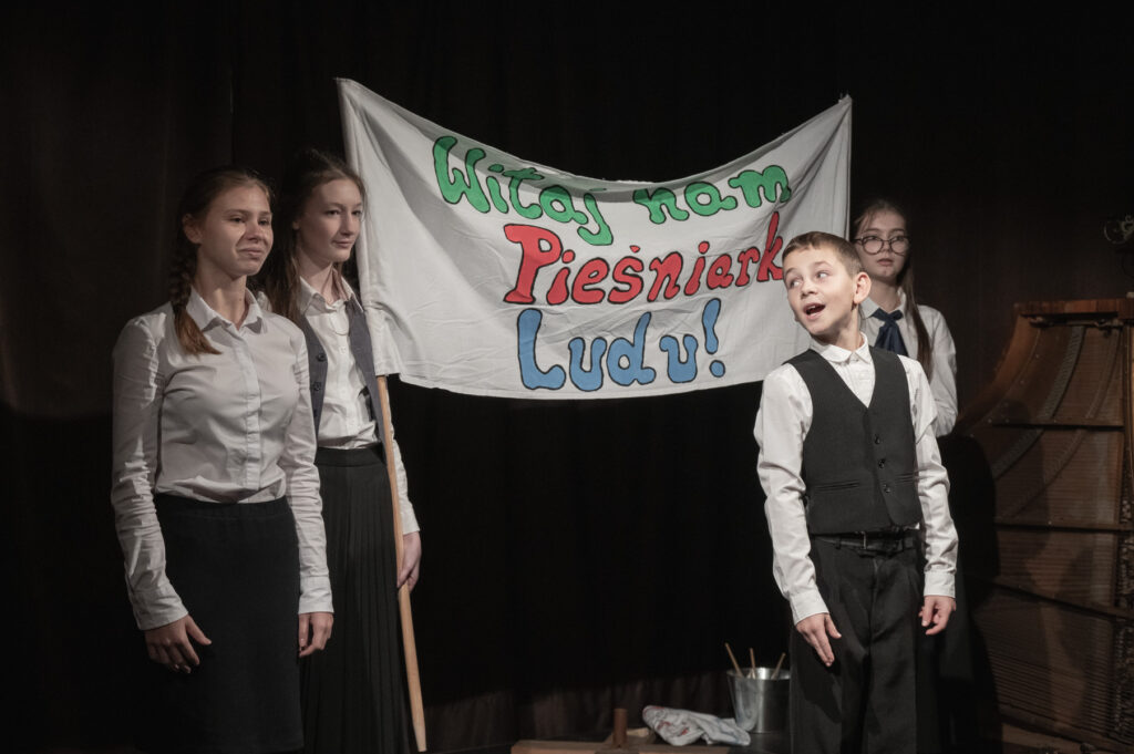 I to tam, gdzie odbywały się warsztaty i próby, wyprzedzając żarnowiecką premierę, w sobotę 14 października miał miejsce pokaz specjalny nowego spektaklu, który obejrzeli m.in. rodzice młodych adeptów sztuki teatru. A przed tym młodym kwartetem reżyser Tomasz A. Żak postawił trudne „teatralnie zawodowe” wyzwania. Trzeba było nie tylko pięknie się wysławiać, aktorsko zagrać scenki, ale też aktorsko zaśpiewać – opowiadając o tym jak to w pewnej miejscowości trwają przygotowania do przyjazdu samej Marii Konopnickiej. Jak to bywa w takich okolicznościach, przygotowywany jest stosowny transparent oraz mowy powitalne. W tych przygotowywaniach, z trójką dziewcząt świetnie radzi sobie „rodzynek” – Gabriel Żychowski; trochę taki łobuziak mający przywódcze inklinacje. Dziewczęta; Milena Pajor, Julia Pergół i Lena Węglarczyk nie dają jednak sobie „w kasze dmuchać’ i okiełznanie Gabriela nie jest dla nich nadzwyczajnym wyczynem. Z jednej strony jest powaga związana z zapowiedzią przybycia niecodziennego gościa, ale też pojawiają się zabawne scenki. Akcja toczy się wartko, wszystko kończy się pomyślnie, bo Ci bardzo młodzi i zdolni aktorzy temu wszystkiemu znakomicie podołali, wykonując powierzone im zadania na najwyższym, możliwym poziomie.