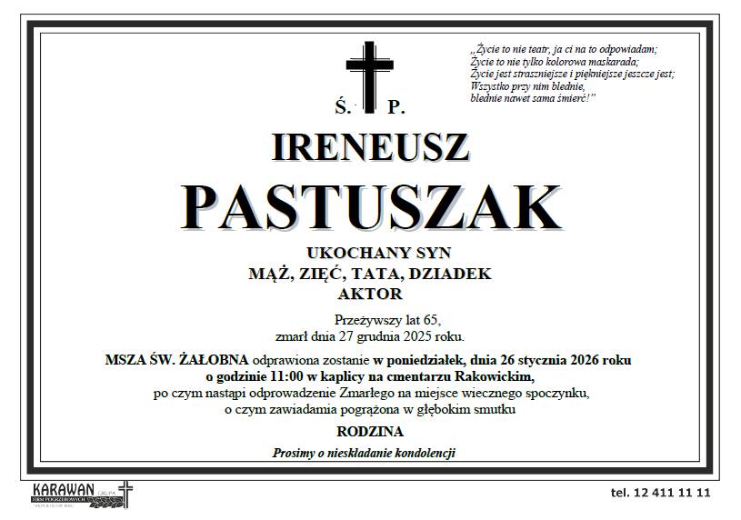 Dziś, w poniedziałek 26 stycznia 2026, na Cmentarzu Rakowickim w Krakowie złożono do rodzinnego grobowca urnę z prochami Ireneusza Pastuszaka, wybitnego tarnowskiego aktora i, o czym mało kto wie, ciekawego poety. Artystę pożegnała rodzina, znajomi, przyjaciele z Krakowa, Rzeszowa i Tarnowa oraz koledzy z tarnowskiego Teatru im. Ludwika Solskiego, gdzie przez ostatnie lata pracował i gdzie w ubiegłym roku świętował 45-lecie swojej pracy na scenie! Obszerny tekst poświęcony barwnej postaci śp. Ireneusza prezentowaliśmy tuż po jego śmierci, która miała miejsce 27 grudnia ubiegłego roku podczas urlopu spędzanego w Maroko… Teraz prezentujemy kilka jego oryginalnych wierszy, jakie autor niniejszej relacji otrzymał na przestrzeni wielu lat znajomości z poetą.