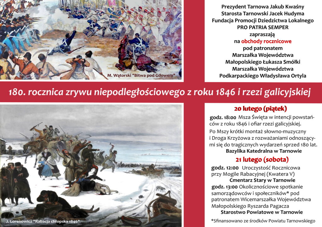 Wszystko zaczęło się na trzy dni przed wybuchem powstania – Rabacji, Austriacy – dowiedziawszy się o rewolucyjnych planach Polaków – sprowokowali galicyjskie chłopstwo do wystąpienia przeciwko szlachcie. Pierwsze rozboje miały miejsce wieczorem 18 lutego 1846, a masowa napaść chłopów na magnackie dwory, a nawet kościoły, rozpoczęła się dzień później. W bestialski sposób wymordowano blisko trzy tysiące osób, głównie ziemian, urzędników dworskich i rządowych oraz przedstawicieli duchowieństwa. Aby nie zapomnieć o tej narodowej tragedii, która w Tarnowie i okolicach w ciągu kilkunastu dni spustoszyła Tarnowskie, Sanockie, Nowosądeckie i część Jasielskiego, przynosząc wyjątkowo krwawe żniwo, warto o niej przypominać – szczególnie młodzieży…